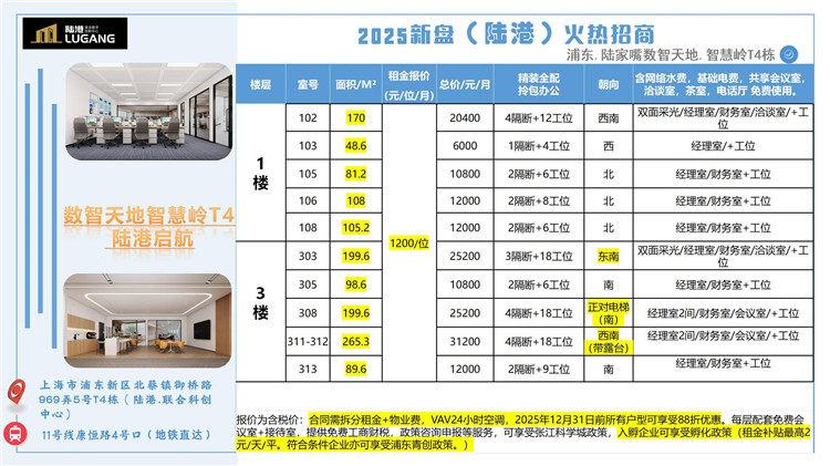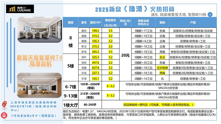 定制装修:玻璃隔断+地毯+LED照明+24小时VRV空调,租金3.2元/㎡/天(净价2.9元),两年起签,免租期最高12个月