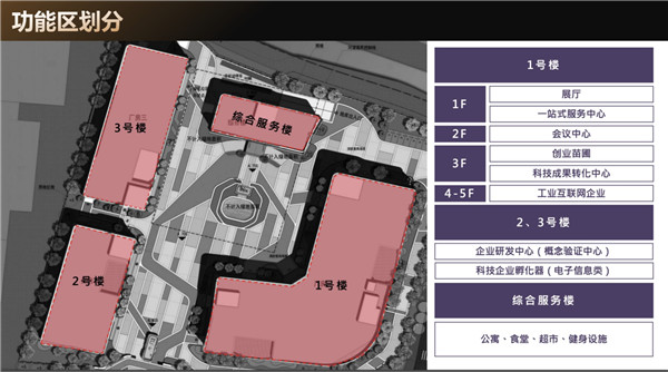 1号楼:1F展厅、一站式服务中心;2F会议中心;3F创业苗圃;4-5F工业互联网企业。