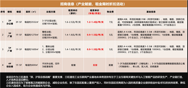 园区为三旺通信“深、沪双总部战略”重要基地,专注于工业互联网關鍵技術與人工智能產品的研发生产、产业链打造、人才培养及项目孵化。园区提供租金补贴/折扣政策,降低企业入园成本,助力企业快速成长。