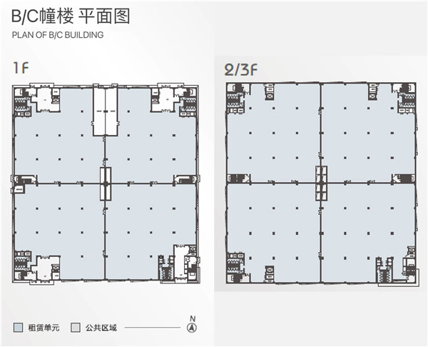 B/C幢:15404㎡,层高5–7米,荷载500kg/㎡,得房率87%