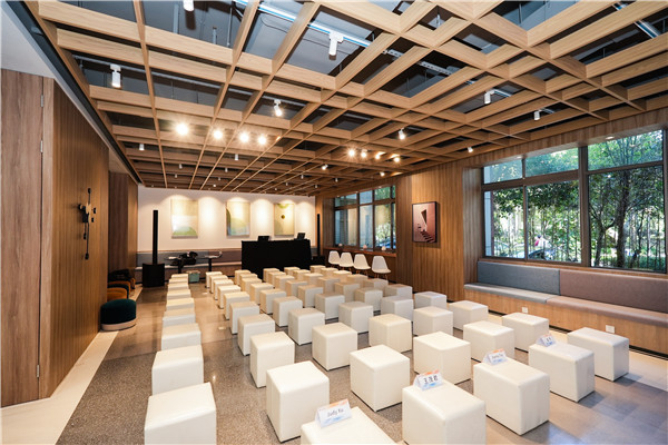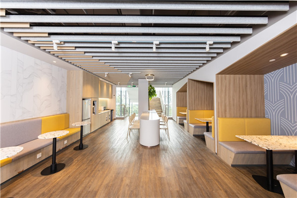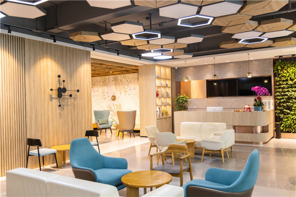 共享会议室、打印机、茶水间、员工餐厅;星巴克、瑞幸、喜士多便利店;健身区含拳击、瑜伽、高尔夫、攀岩等。