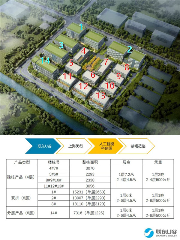 联东U谷·人工智能科创园位于闵行马桥紫东路55号,2022年竣工,为50年产权104工业地块,可环评。在售面积2294-3070㎡,首层7.2米层高、2吨承重,标准层4.5米。25分钟直达虹桥机场,45分钟至浦东机场,配套人才公寓、园区餐厅、免费班车及新能源充电站,提供投融资、政府申报等增值服务,聚焦生物医药、智能制造等战略性新兴产业。