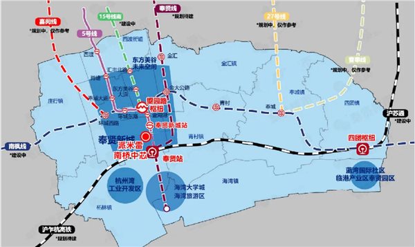 ?沪乍杭高铁在建,以奉贤站为核心融入长三角轨交网络,15号线南延望园路也在建,方便物流运输与人员往来。
